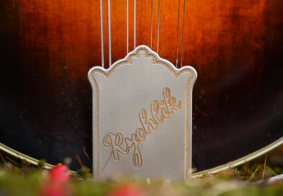 F-5, Varnish finish over hand-applied sunburst stain, Adirondack red spruce top, sugar maple 2-piece back and sides. Golden Age tuners. Nickel-plated James tailpiece. Flat fretboard with small (vintage-style) Evo-gold frets. Fully bound with traditional celluloid multi-ply binding. Figured ebony headstock veneer.